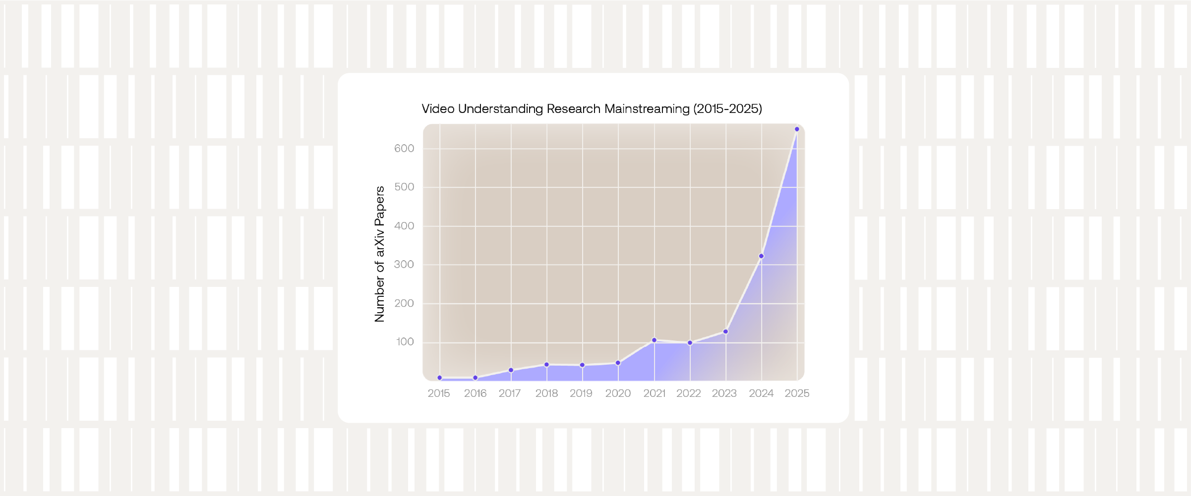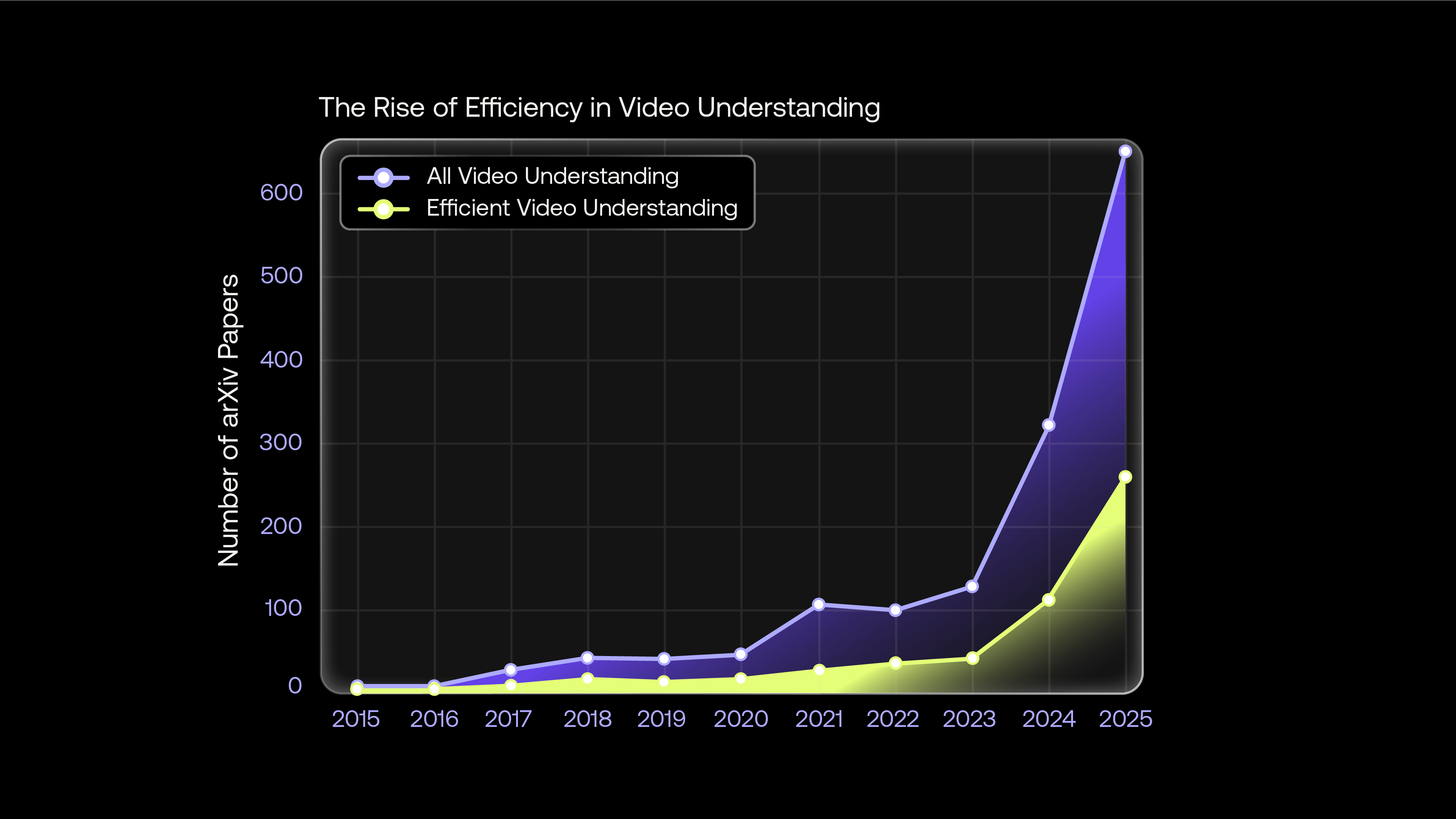 This analysis tracks arXiv computer science publications from 2015 to 2025 across two primary research themes: video understanding (the broad field of building models that comprehend video content) and efficient video understanding (work that explicitly addresses computational constraints such as FLOPs, parameters, latency, or memory footprint). The data serves as a thermometer of research attention rather than a complete census of the literature. (Harvey, 2024)